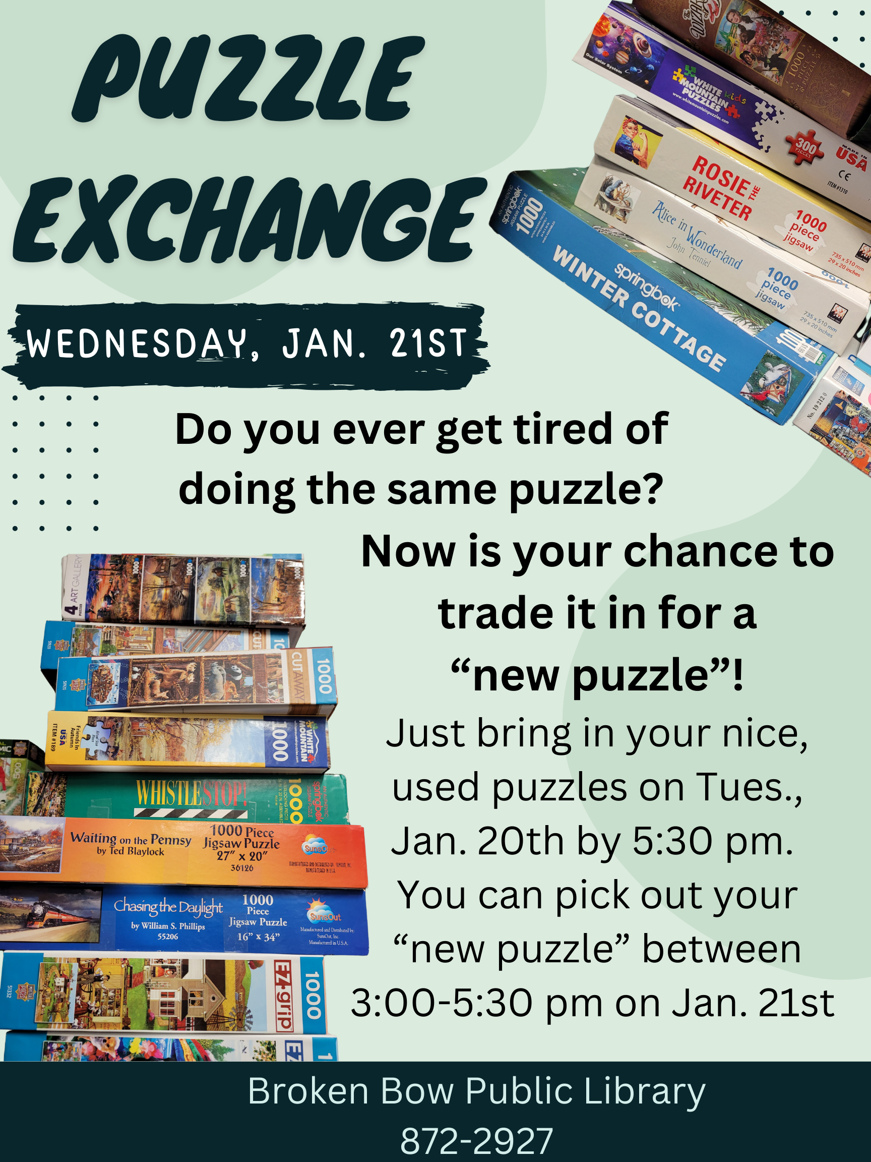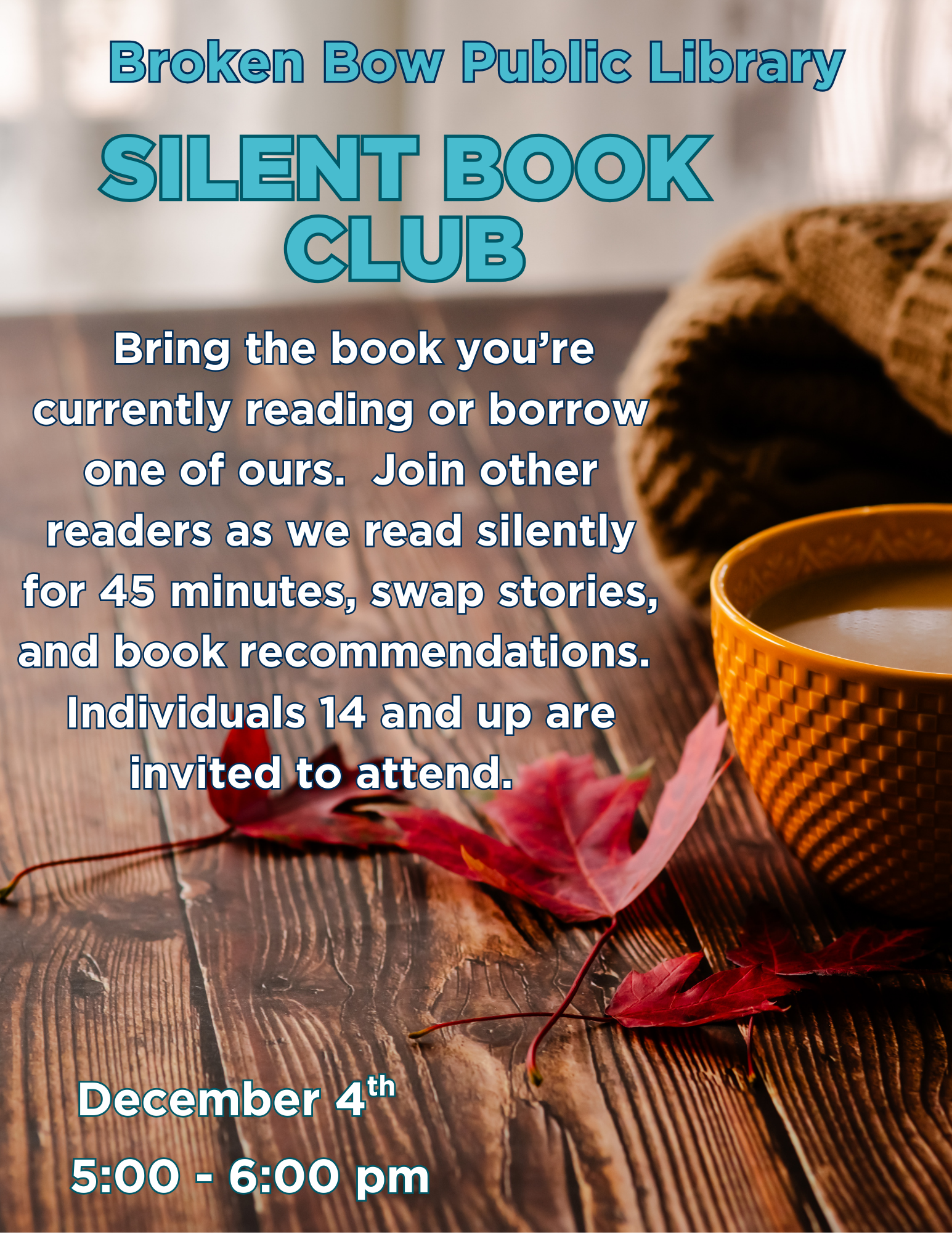 Join us for Take a Break Book Club at noon on Tuesday, Dec. 23rd, to discuss the book, Our Missing Hearts by Celeste Ng. Stop by the library and pick up a copy. For more information please call 872-2927.